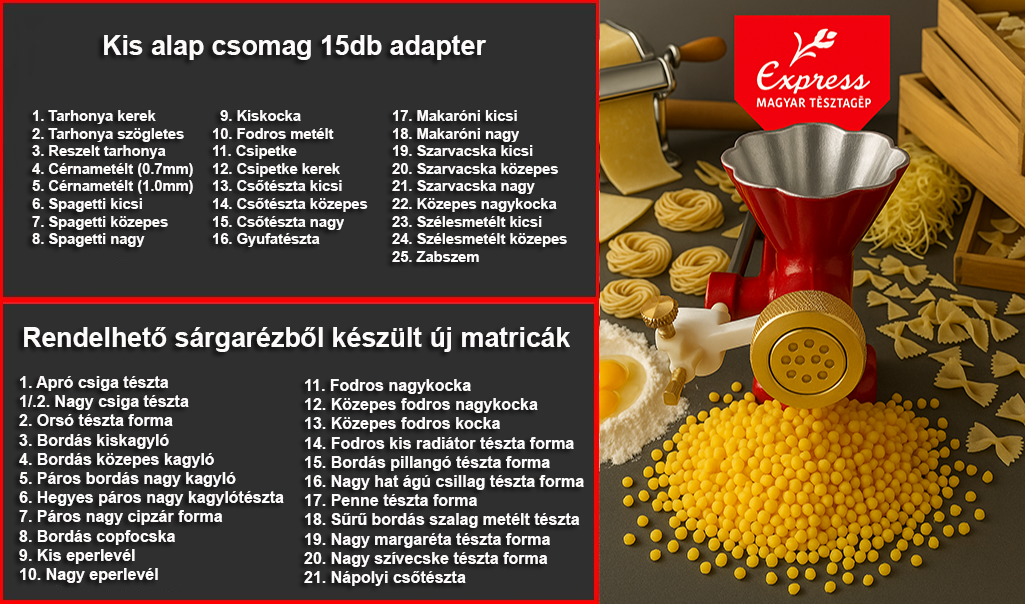 Kézivágókar, hajtókar, behordó csiga, távtartó gyűrű, szorítócsavar, levehető illetve átfordítható fogaskerék 15 darab matrica tészta formázó ,fél ,illetve dupla karú vágókés, és a tésztagép váza.